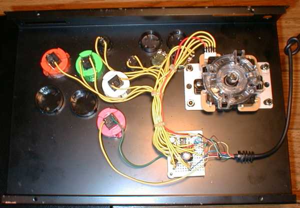 内部の配線も特に難しいところは無いと思います。ジョイスティックから出す線は 8 本なので,DIN コネクタにしても良いでしょう。安く上げる場合は,出口付近で結び目を作って少々引っ張っても線が切れないようにしておきます。内部の線はビニールタイを使って束ねるとスッキリします。今回はコントロール基板にかなり小さいものを使いましたが,内部は十分にスペースがあるので,もっと大きな基板を使ってかまいません。