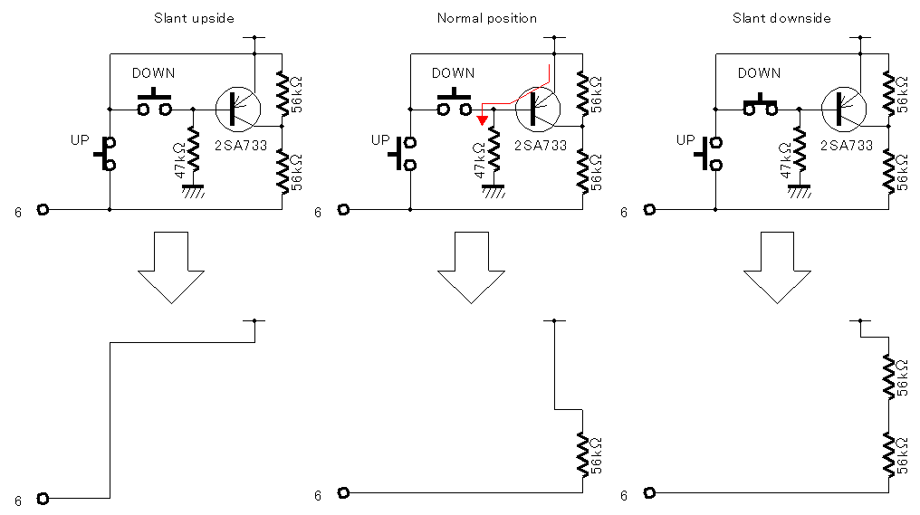 スティック部分の回路は,トランジスタをスイッチとして使用しています。まず,UP ボタンが押されている状態,つまりスティックが上に倒されている場合は,そのものずばり,5V が出力に直結されます。次に UP/DOWN ボタンどちらも押されていない状態,つまりスティックが中立の場合ですが,この場合はベースに電流が流れていますから,コレクタ-エミッタ間は導通状態になります。従って,出力には 56kΩ を介して 5 V がかかることになります。最後に DOWN ボタンが押されている状態,つまりスティックが下に倒されている場合ですが,この場合はベース電位とエミッタ電位が同じなのでトランジスタは OFF になっています。従って,出力には 2 つの 56kΩを介して 5V がかかることになります。