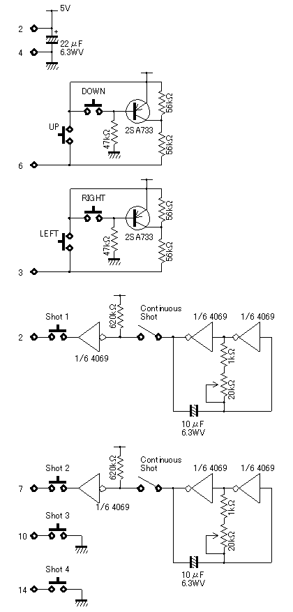 以上から,作った回路が右図です。連射機能はボタン 1, 2 にしかつけていませんが,大抵のゲームはこれで間に合うはずです。追加したい人は同じ回路を 3, 4 にも付けてください。念のためピン配置図も載せておきます。